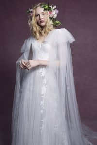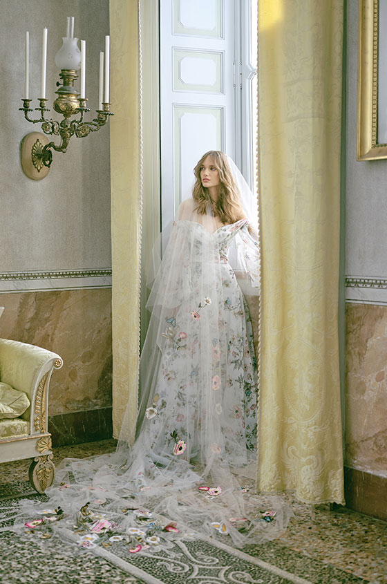 Monique Lhuillier; known around the world for her couture bridal collection, Lhuillier’s designs encompass the feeling of femininity, allure and glamour. Her recently released Fall 2020 bridal, which she referred to as “a celebration of life”, is absolutely stunning. Lhuillier tends to be bold with colorful florals, botanical prints, and silhouettes composed of billowing sleeves and exaggerated trains. One of Kellens’ favorite things about Lhuillier is the use of versatile pieces such as detachable boleros, capes and vails like you’ve never seen before. This is the designer for the bride that wants to bring a modern twist to different traditional elements.