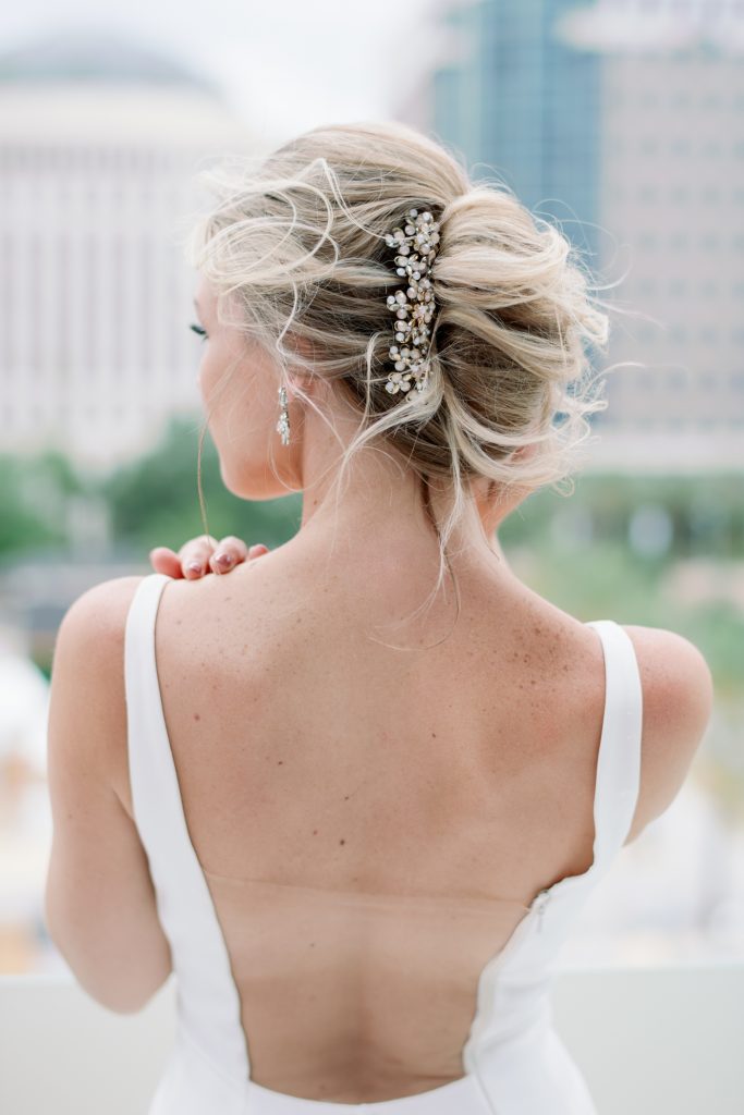 We went with two different Ines Di Santo gowns, both provided by The Bridal Finery. The first one was “Quince”, a clean and modern ball gown. This dress was perfect for this windy rooftop ceremony! We later went outside downstairs where the wind continued to amaze us! The second dress, “Smitten”, was more of a form-fitting gown with an open back. Both dresses went perfect with the burgundy-colored suit from Leonardo 5th Avenue.