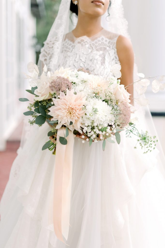 Our bride’s attire was a personal favorite! She wore an incredible ballgown by Ines di Santo from The Bridal Finery and we topped it with an elaborate french lace veil – custom designed by Girl and a Serious Dream! To top it off – Bluegrass Chic created the most beautiful and absolutely dreamworthy bouquet with silk ribbons, dahlias and Queen Anne’s lace!