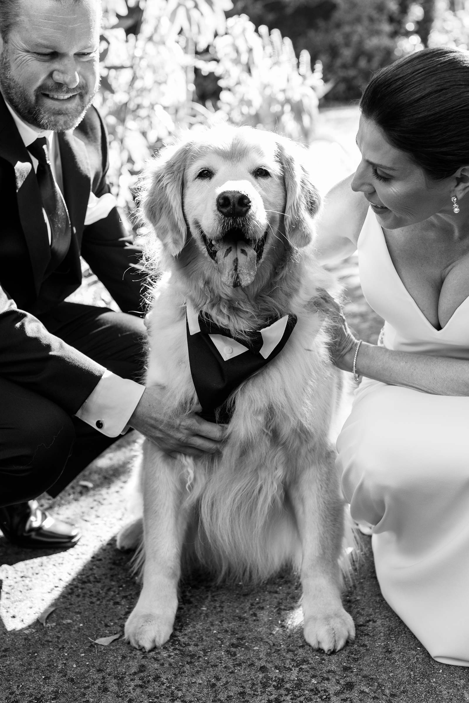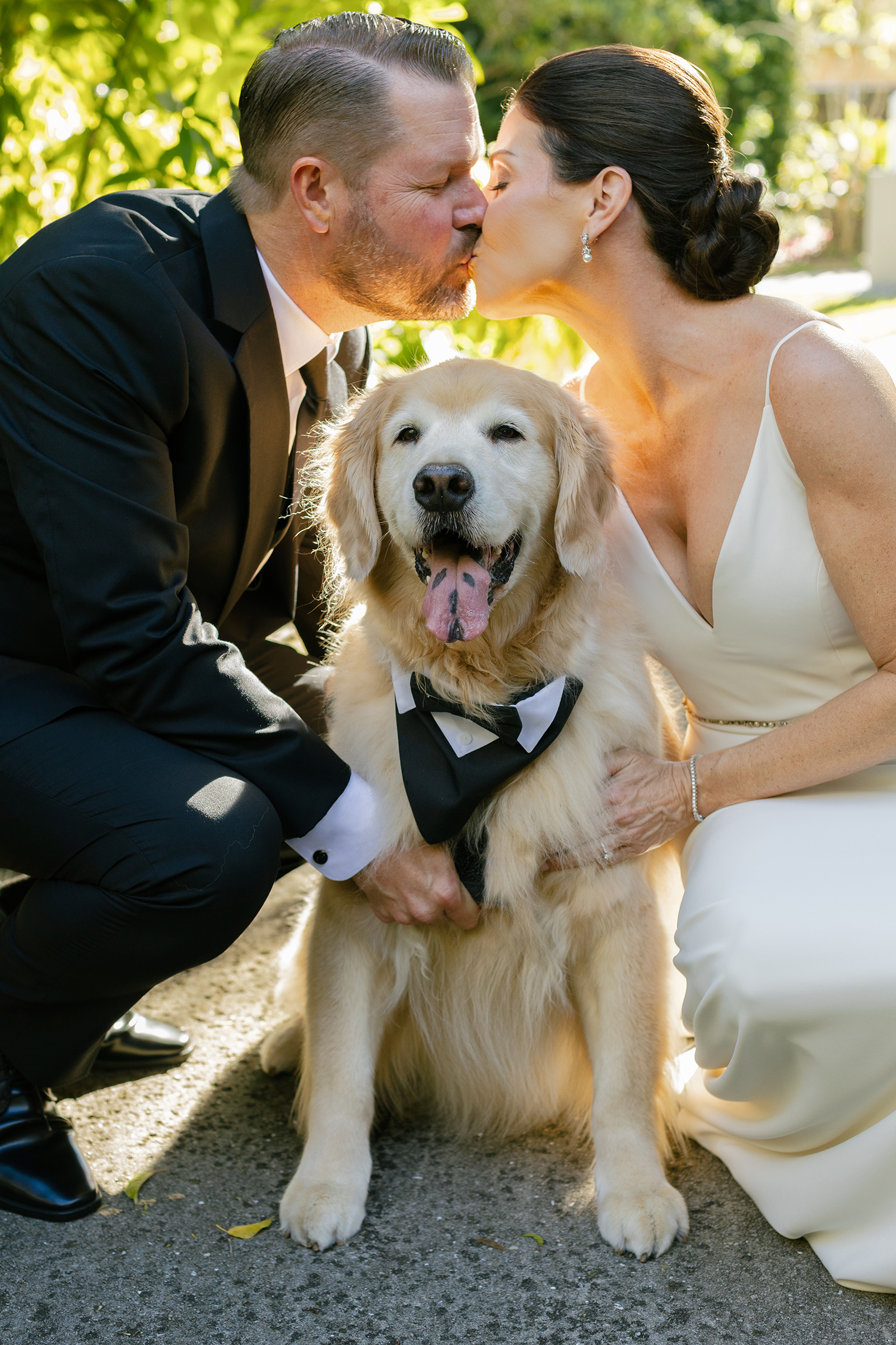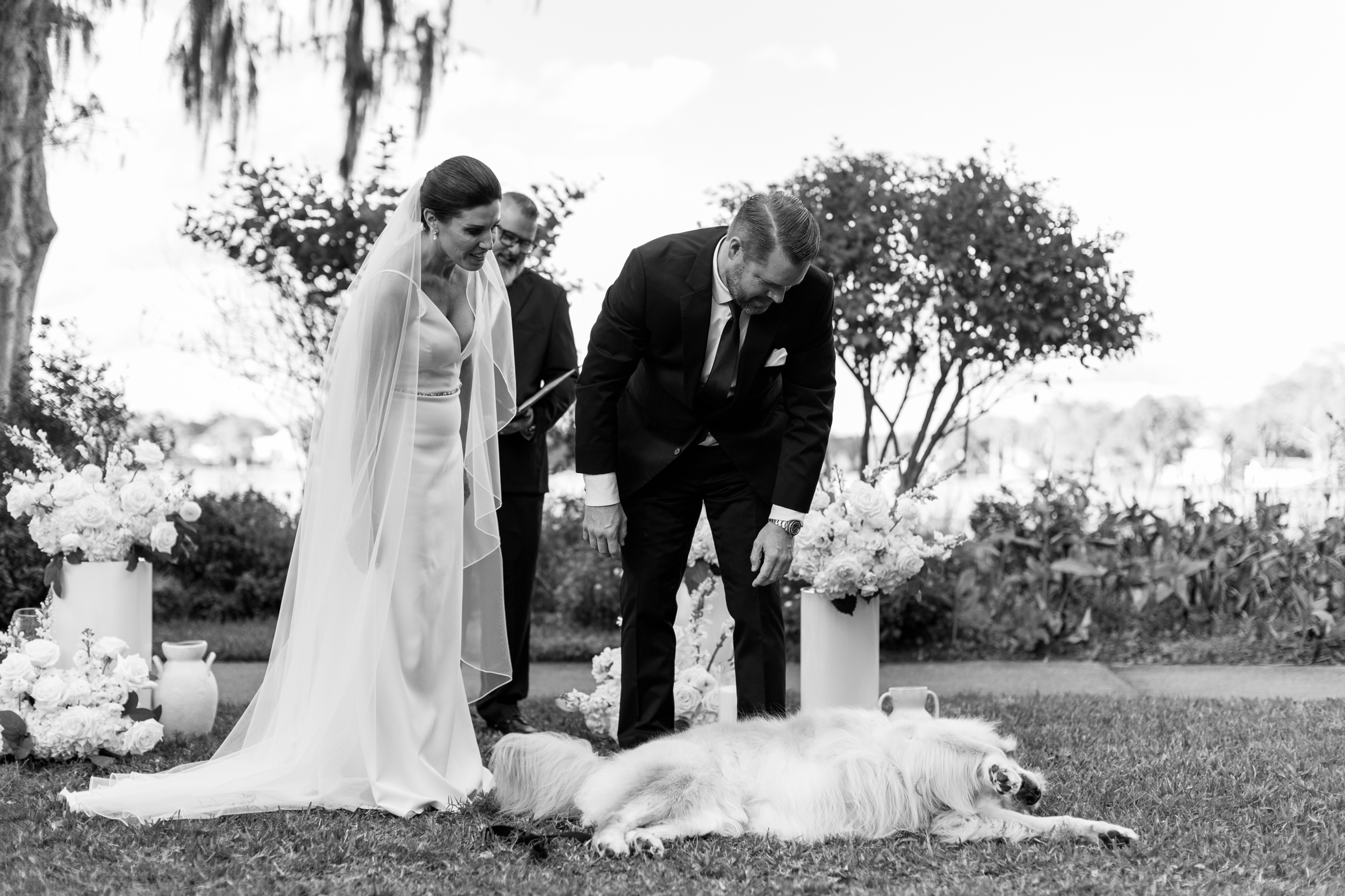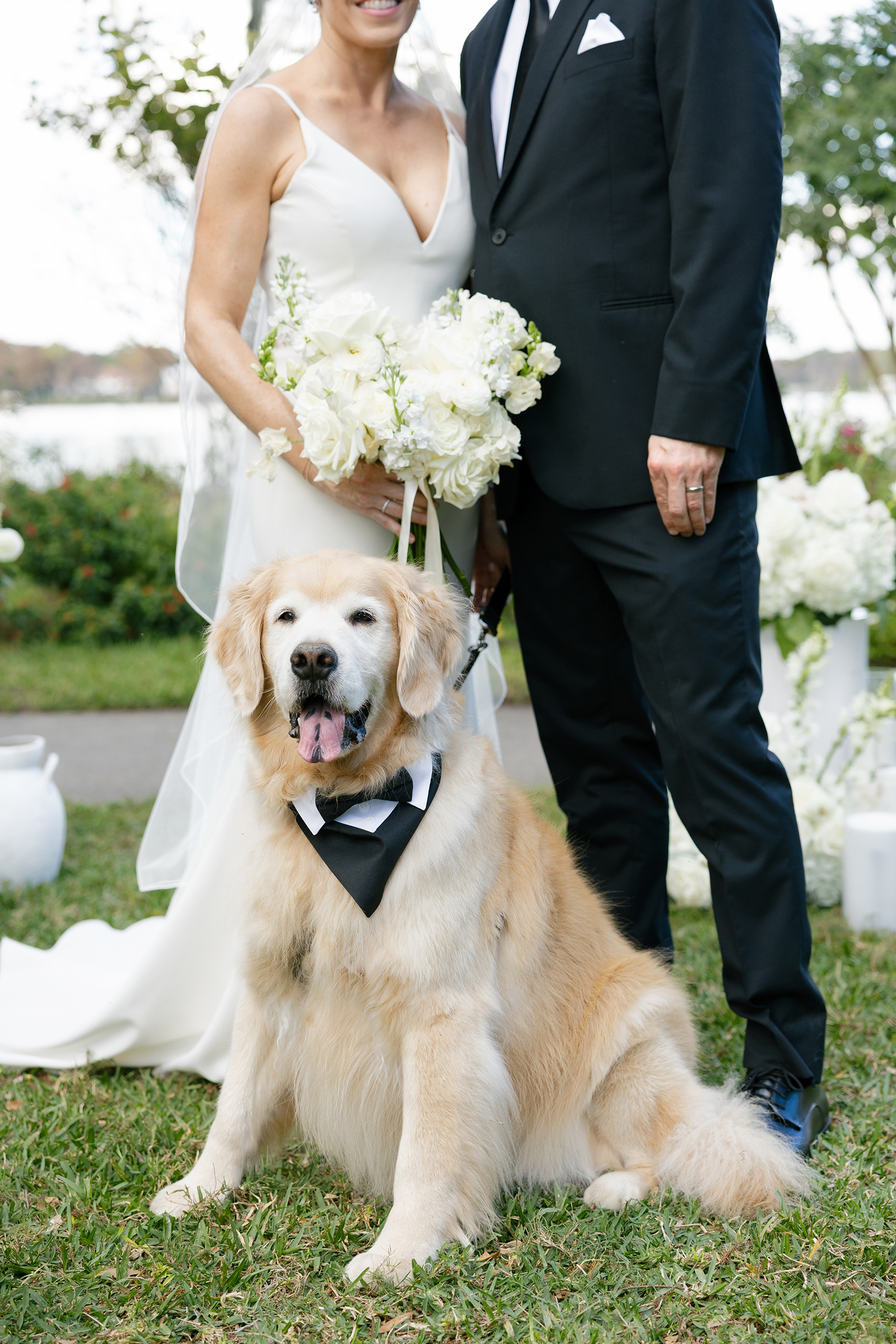 Bride and groom with golden retriever dog in Winter Park wedding