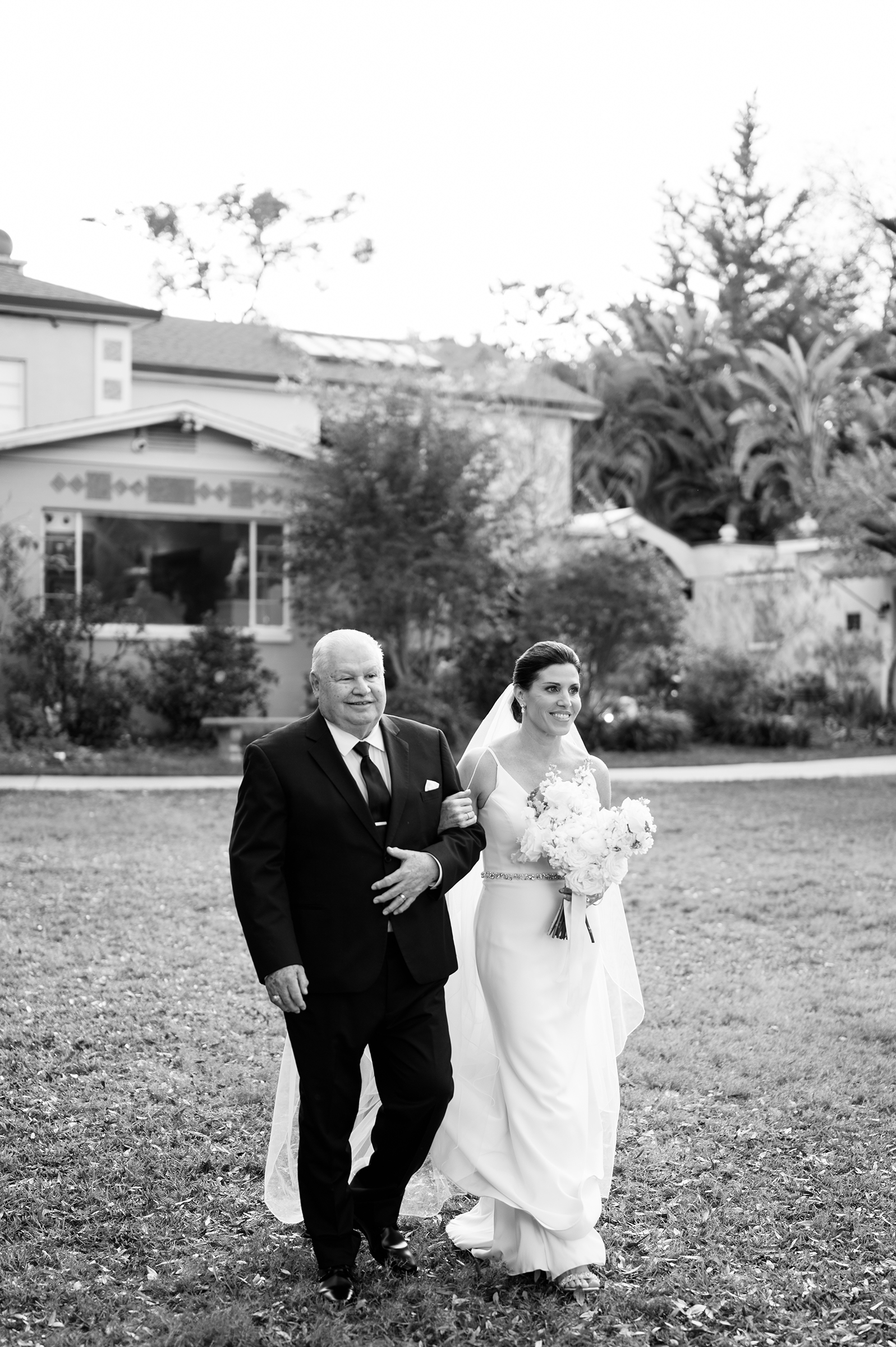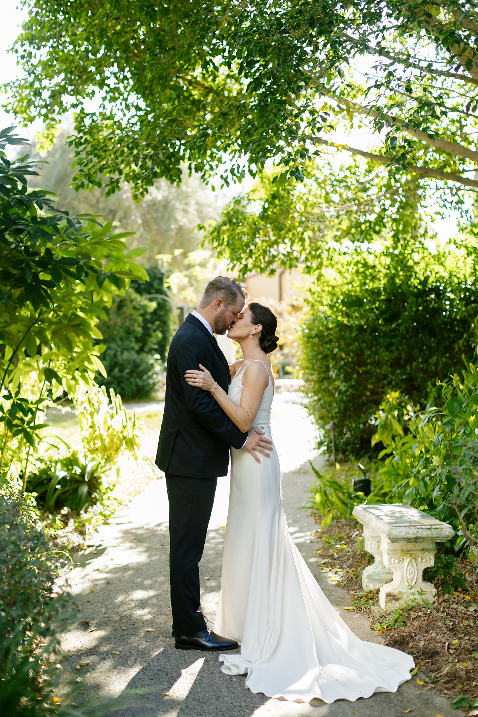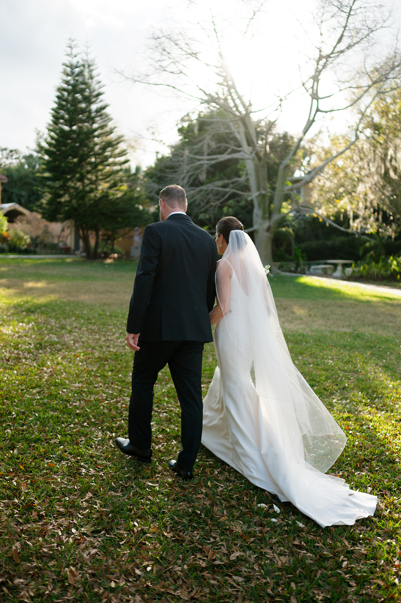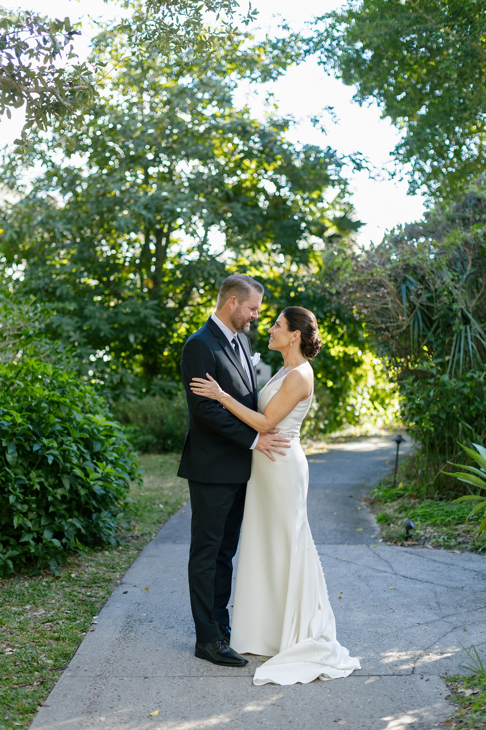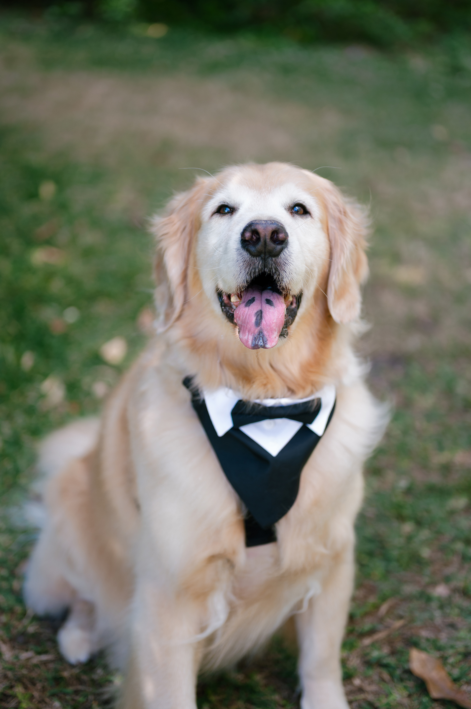 Bride and groom with golden retriever dog in Winter Park wedding