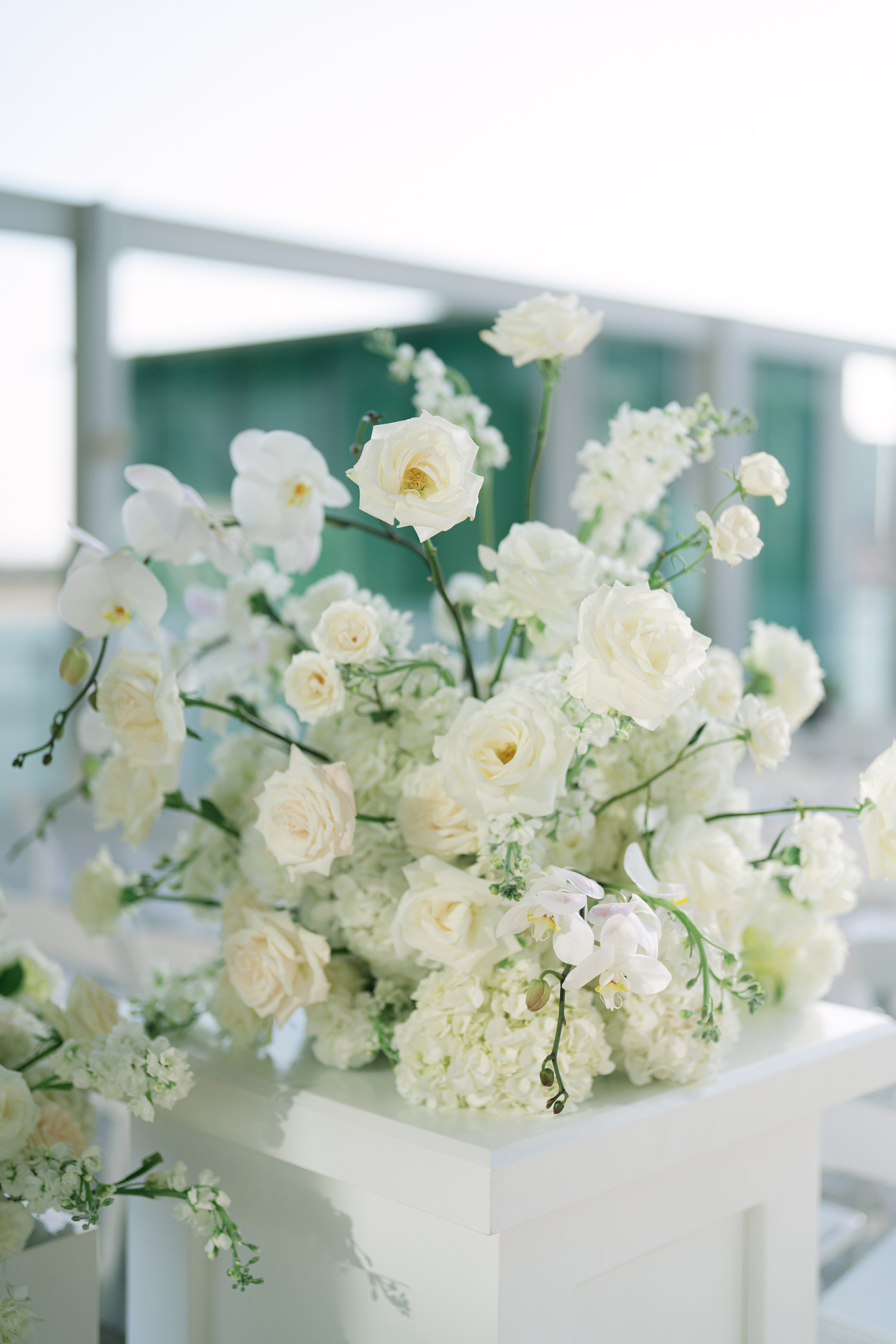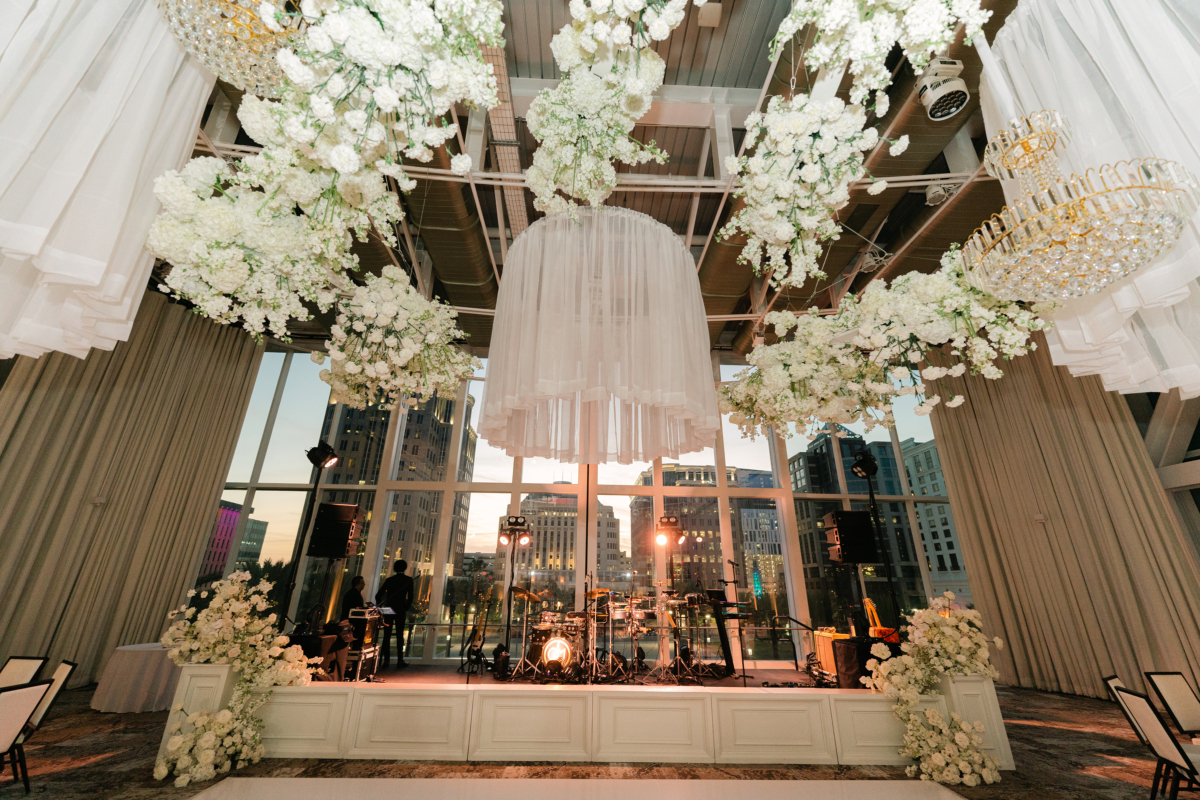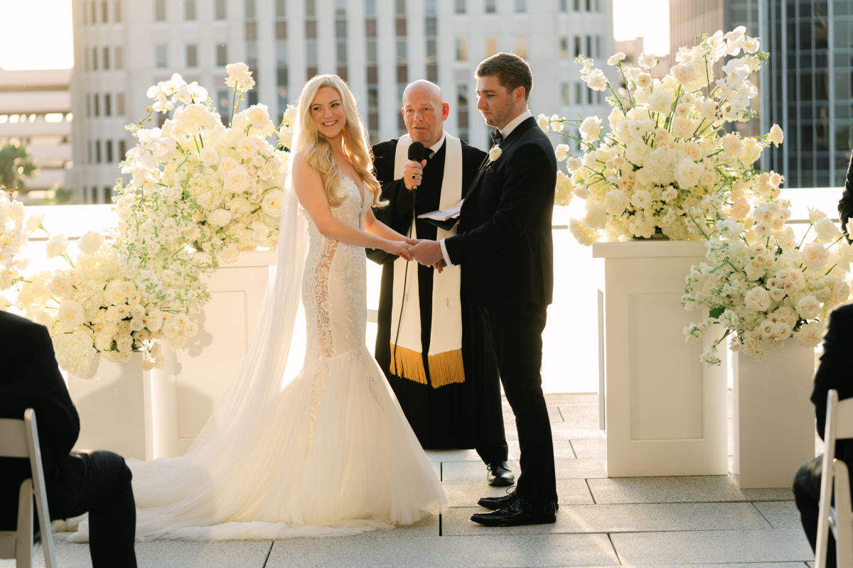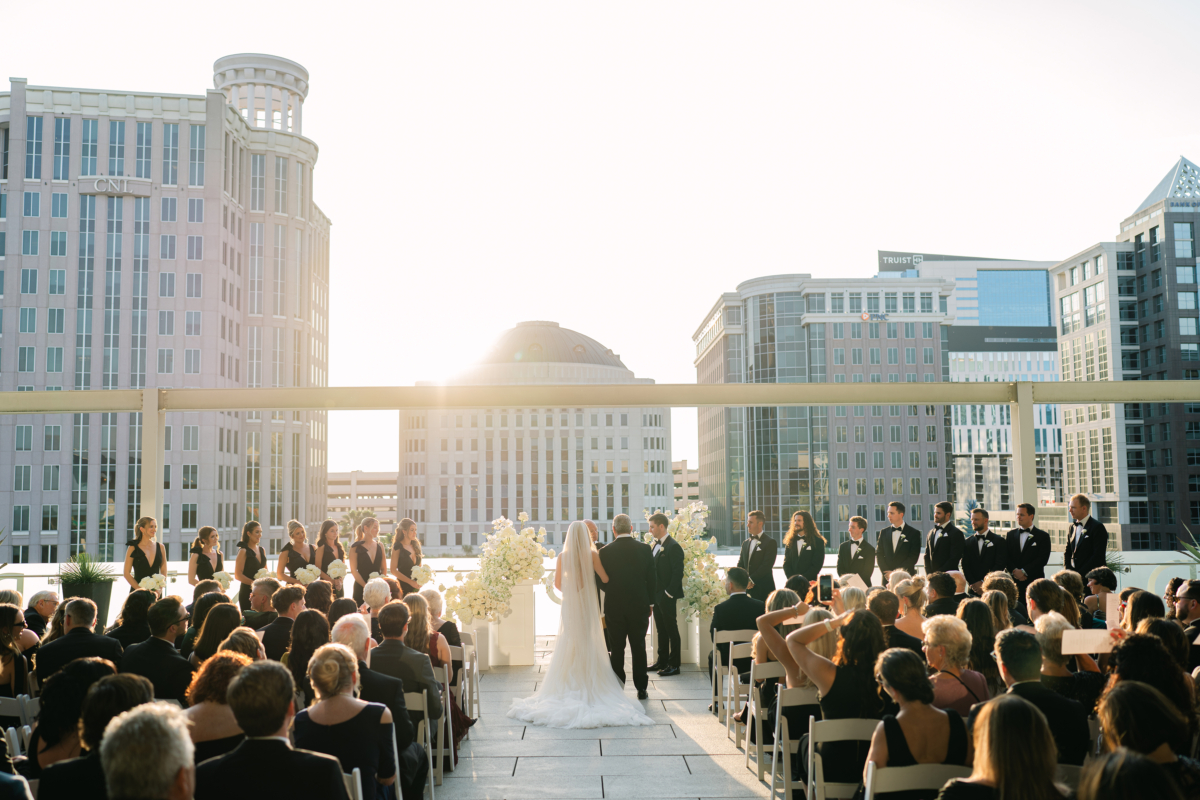 The sunlit shadows sprawled across the floor and the classy floral bouquets filled with white roses and baby breaths seamlessly laced Cassidy and Zack’s Dr. Phillips wedding in a breathtaking way. The surrounding views of downtown Orlando further added a layer of depth to immediately contrast the busyness of city to the unwavering nature of the couple. While the pair stood in front of the alter, all the anticipated thoughts and possible what-ifs seemed to dissipate as they took each other’s hands waiting for the official introduction as Mr. and Mrs. Mattison. This sight truly seemed to be a moment taken out of a romance film and hopefully an ounce of that essence was translated onto this digitally space.