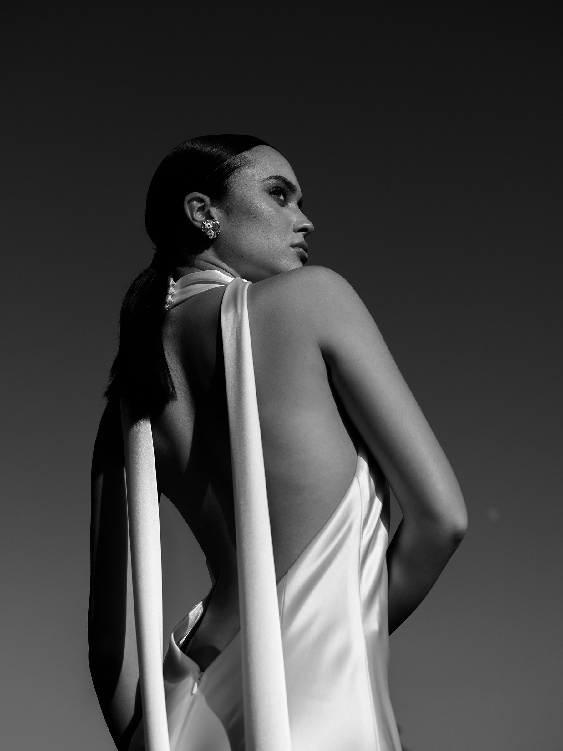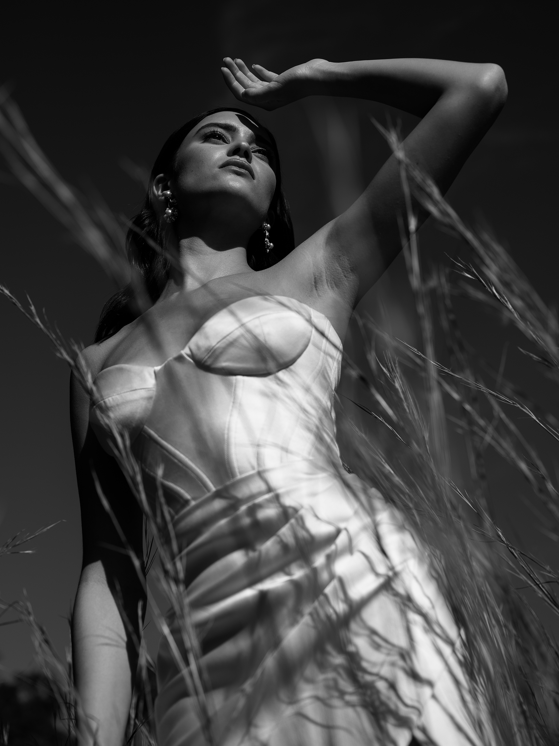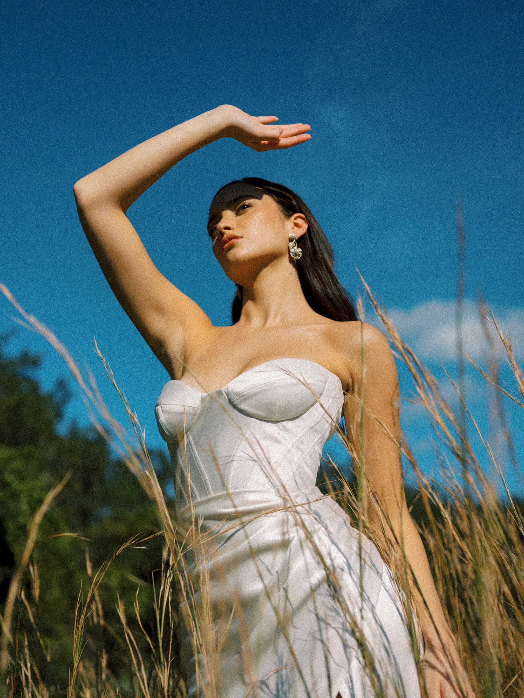 Our vision for this fashion shoot with The Bridal Finery was editorial bridal meets retro twist, captured on my dad’s 1976 film camera. Instead of rushing through the process, we allowed each step to be led with intention. The steady decline of the sun painting soft shadows, the field carrying a quiet hum, and every overlooked detail, became fuel for creating an image that reminded us to pause.