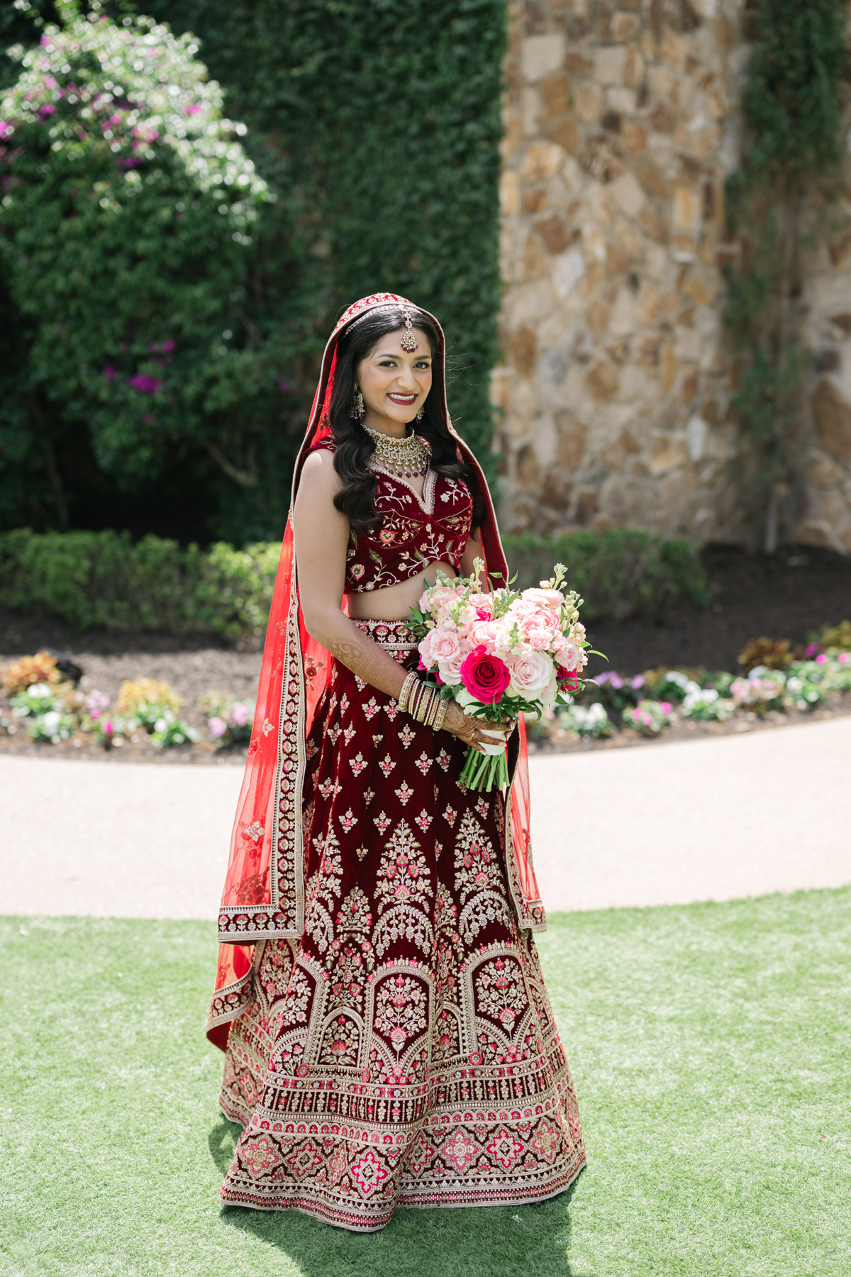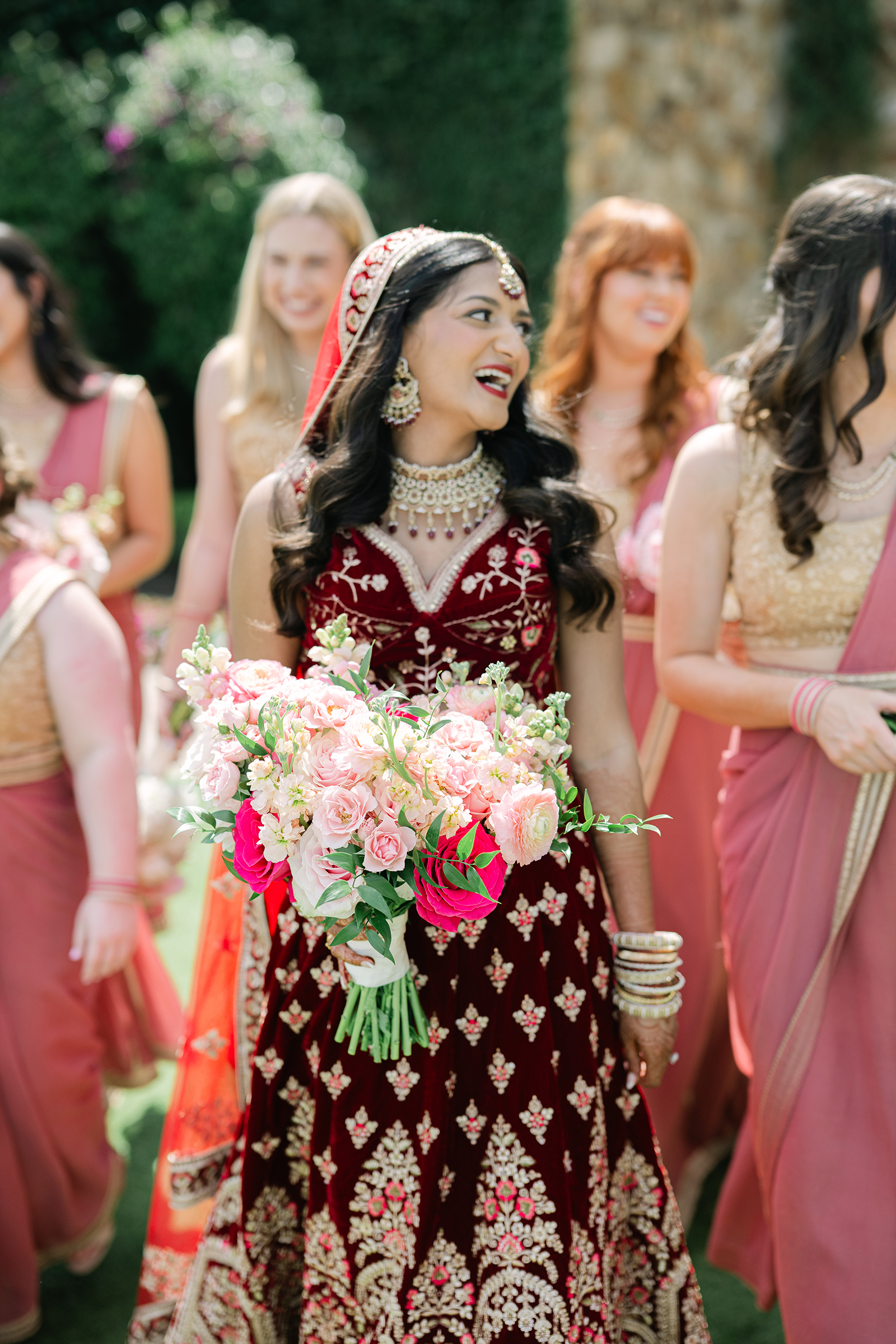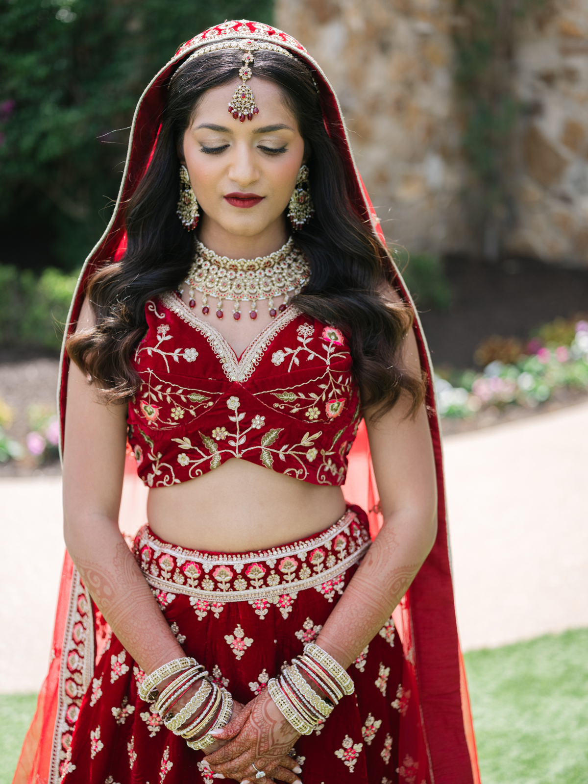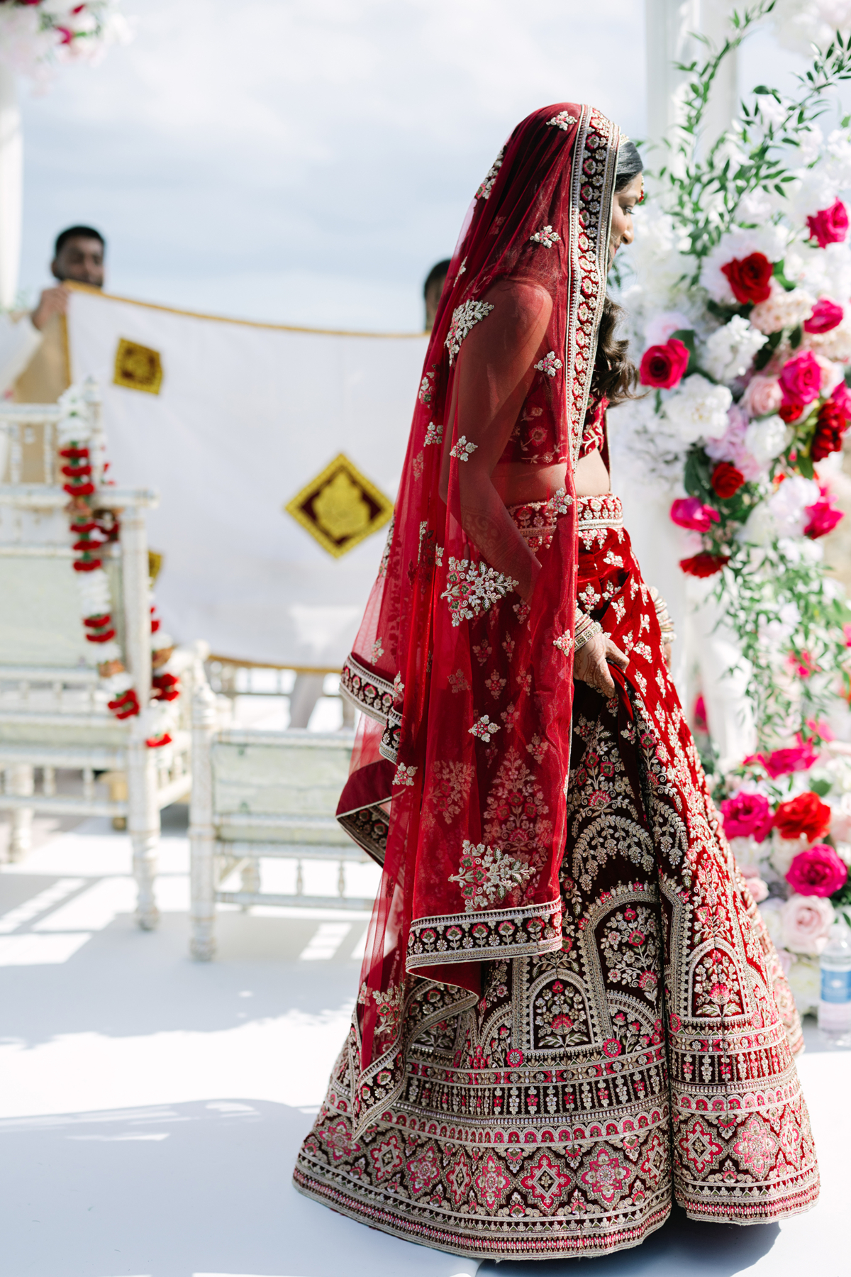 Kayla was the embodiment of true elegance as she arrived to the ceremony with a vibrant red color palette paired with gold intricate designs delicately placed on her saris and, at hand, pink florals chosen by RJ Glam Rentals to welcome a sense of softness. Her makeup and hair was done by Tiffany from Bronze and Glow, that only further enhanced her look with beautiful, soft curls framing her face and a bold red lip that perfectly complimented the color scheme.