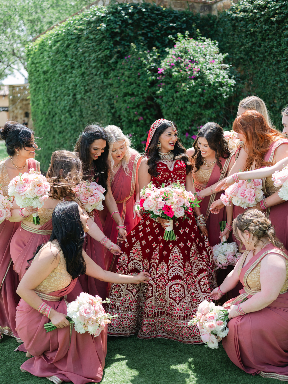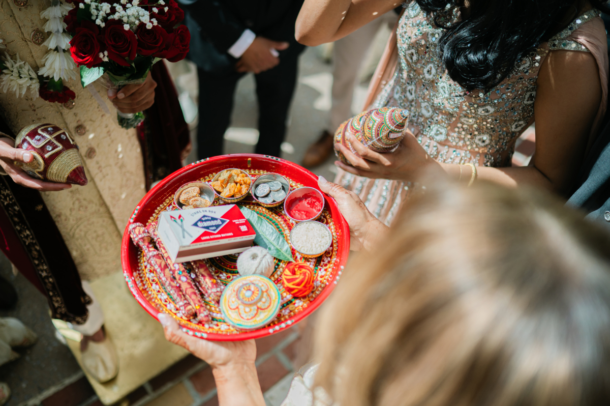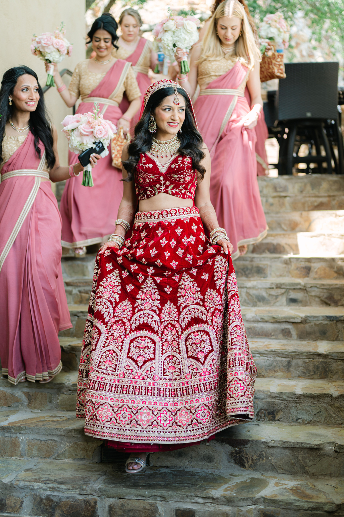 Kayla was the embodiment of true elegance as she arrived to the ceremony with a vibrant red color palette paired with gold intricate designs delicately placed on her saris and, at hand, pink florals chosen by RJ Glam Rentals to welcome a sense of softness. Her makeup and hair was done by Tiffany from Bronze and Glow, that only further enhanced her look with beautiful, soft curls framing her face and a bold red lip that perfectly complimented the color scheme.