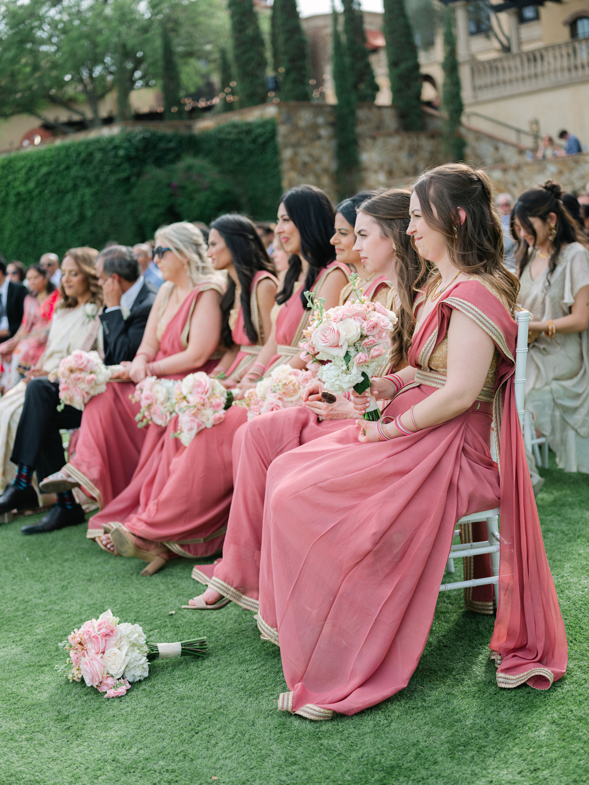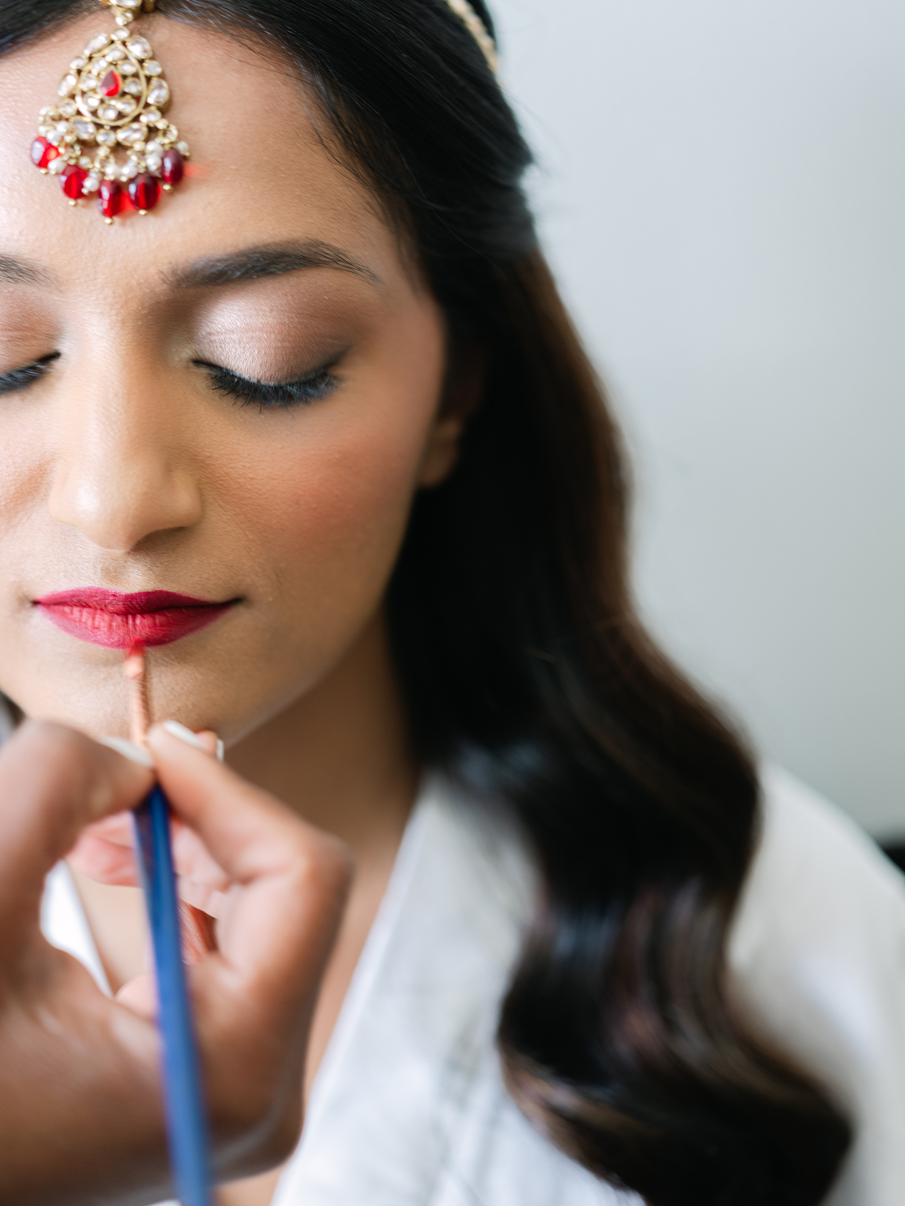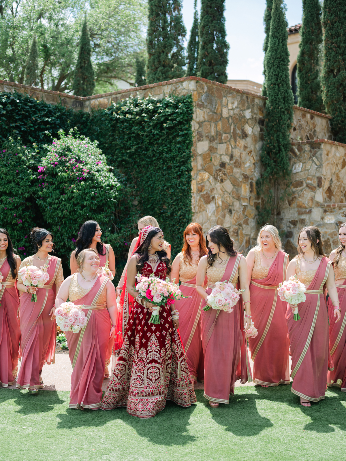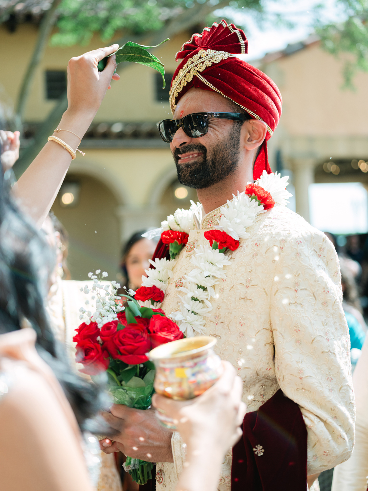 Kayla was the embodiment of true elegance as she arrived to the ceremony with a vibrant red color palette paired with gold intricate designs delicately placed on her saris and, at hand, pink florals chosen by RJ Glam Rentals to welcome a sense of softness. Her makeup and hair was done by Tiffany from Bronze and Glow, that only further enhanced her look with beautiful, soft curls framing her face and a bold red lip that perfectly complimented the color scheme.