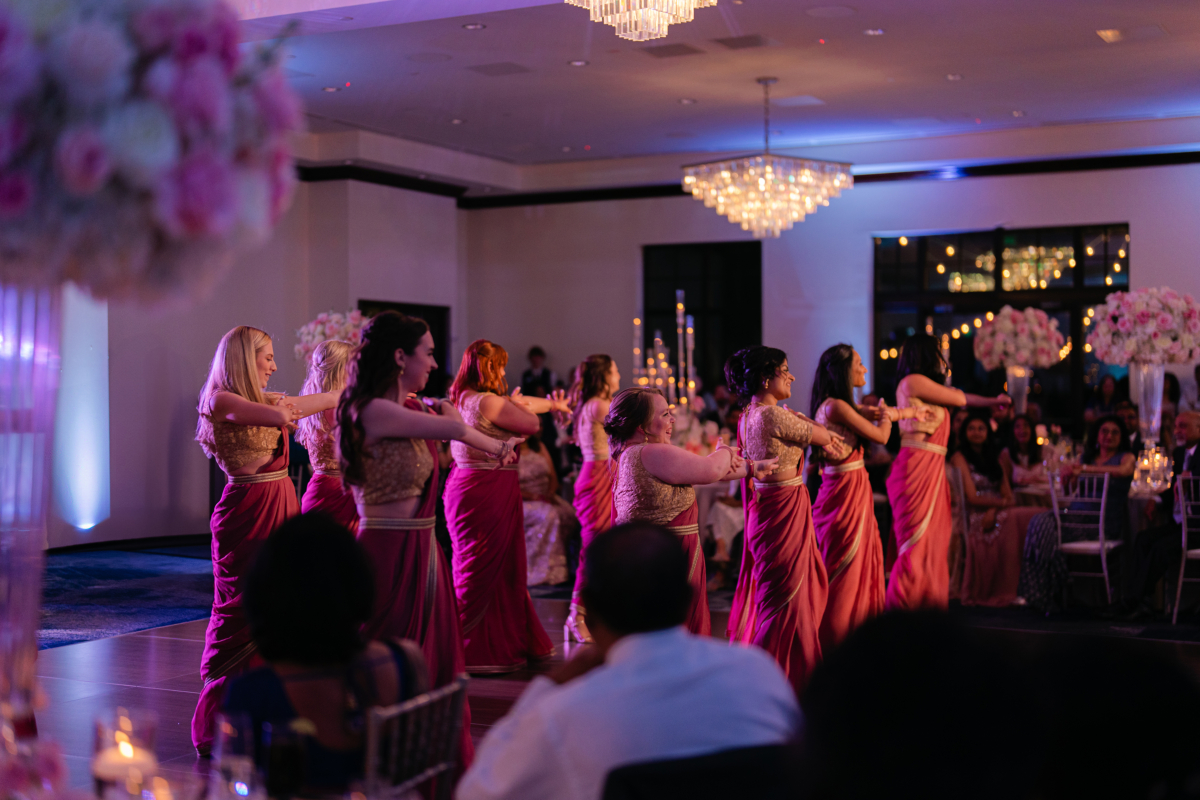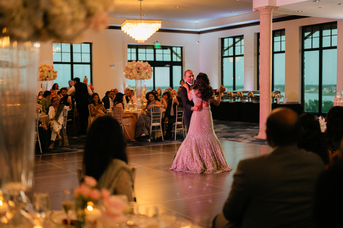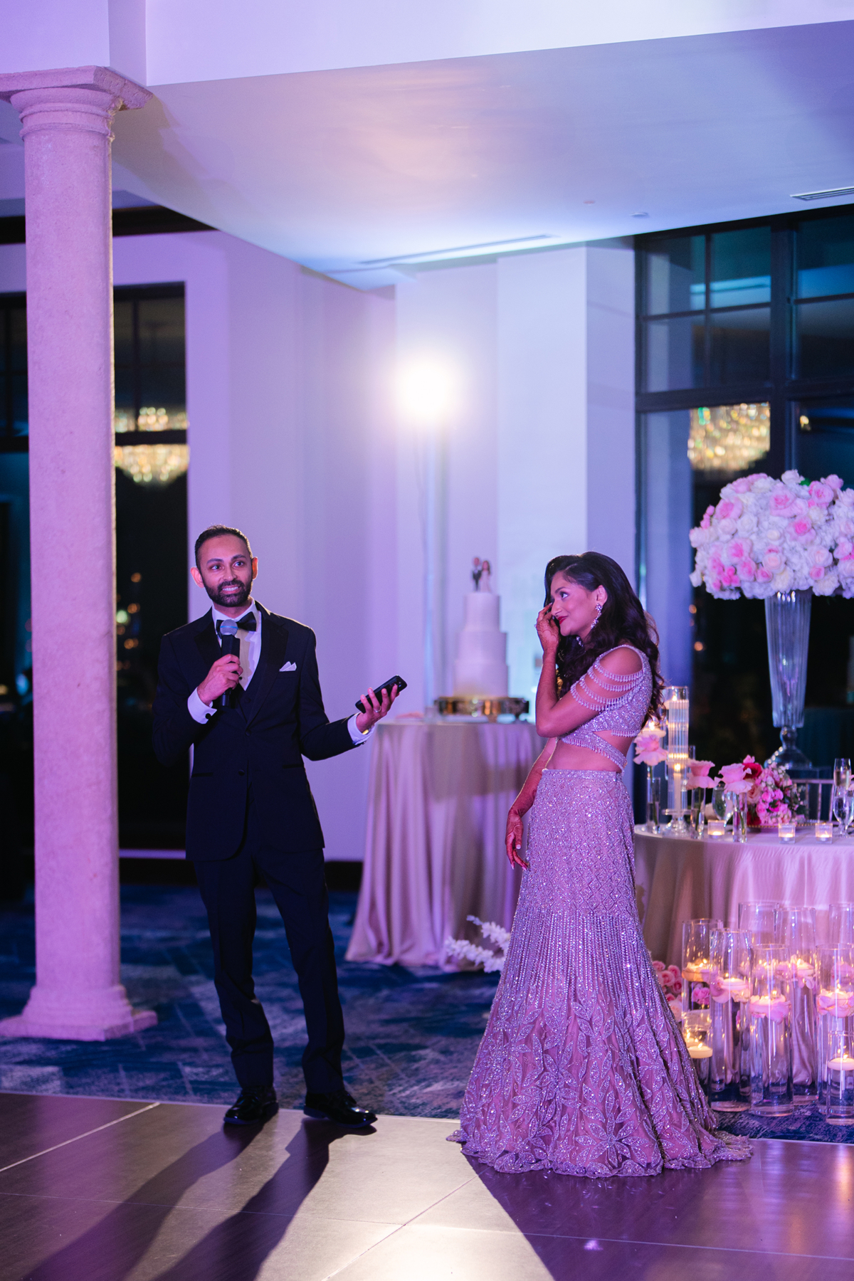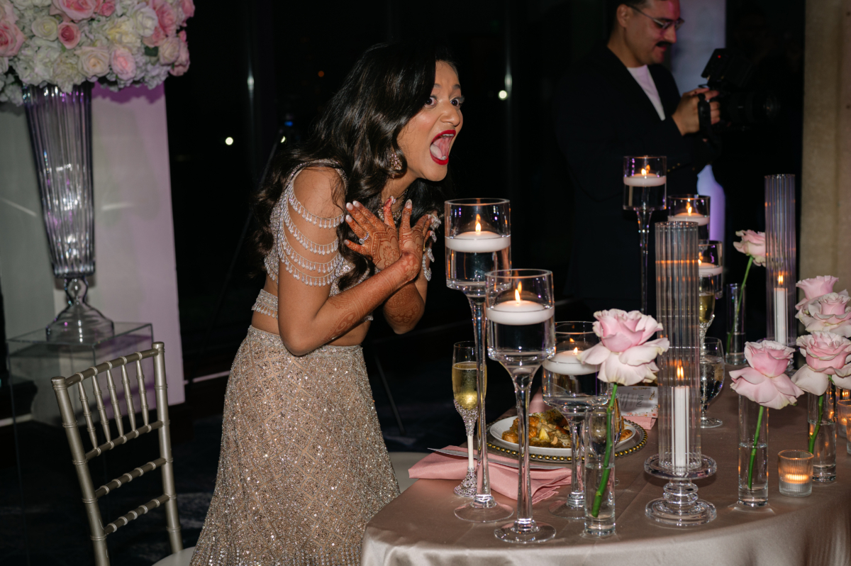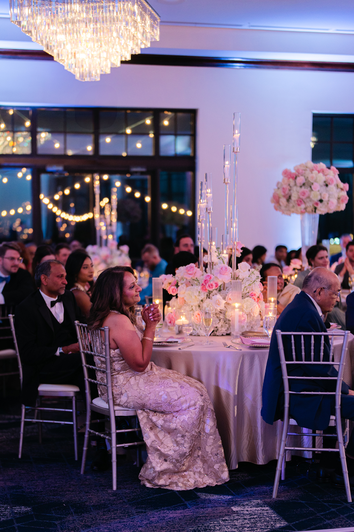 Soft pinks and whites with candlelight lit the Bella Collina Ballroom for their reception. Guests dined on traditional Indian cuisine, thoughtfully curated by the couple with their families.