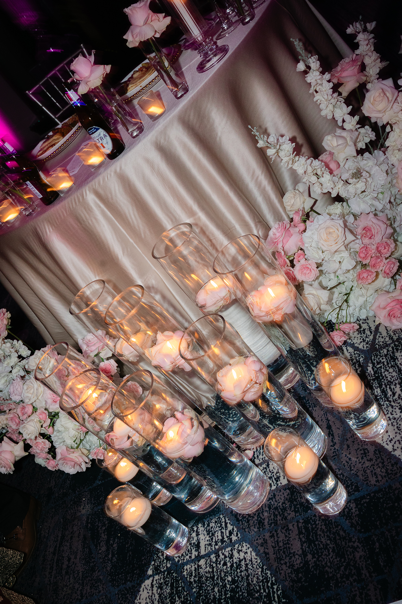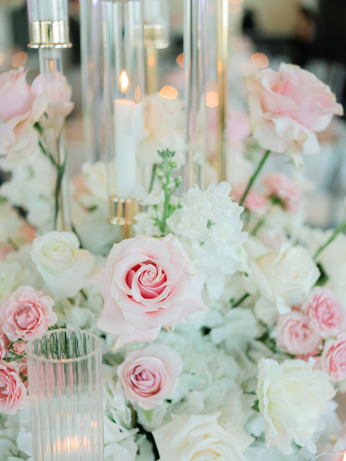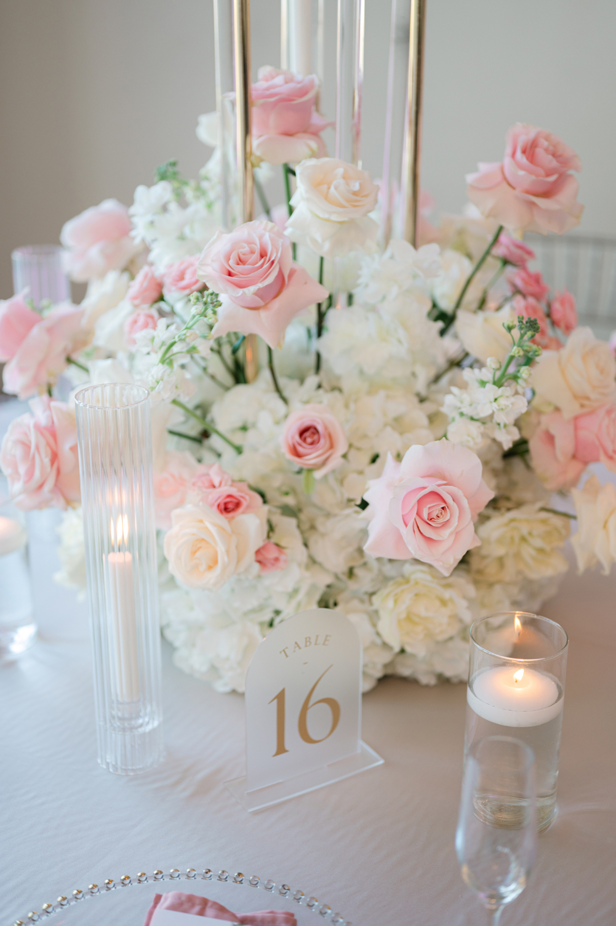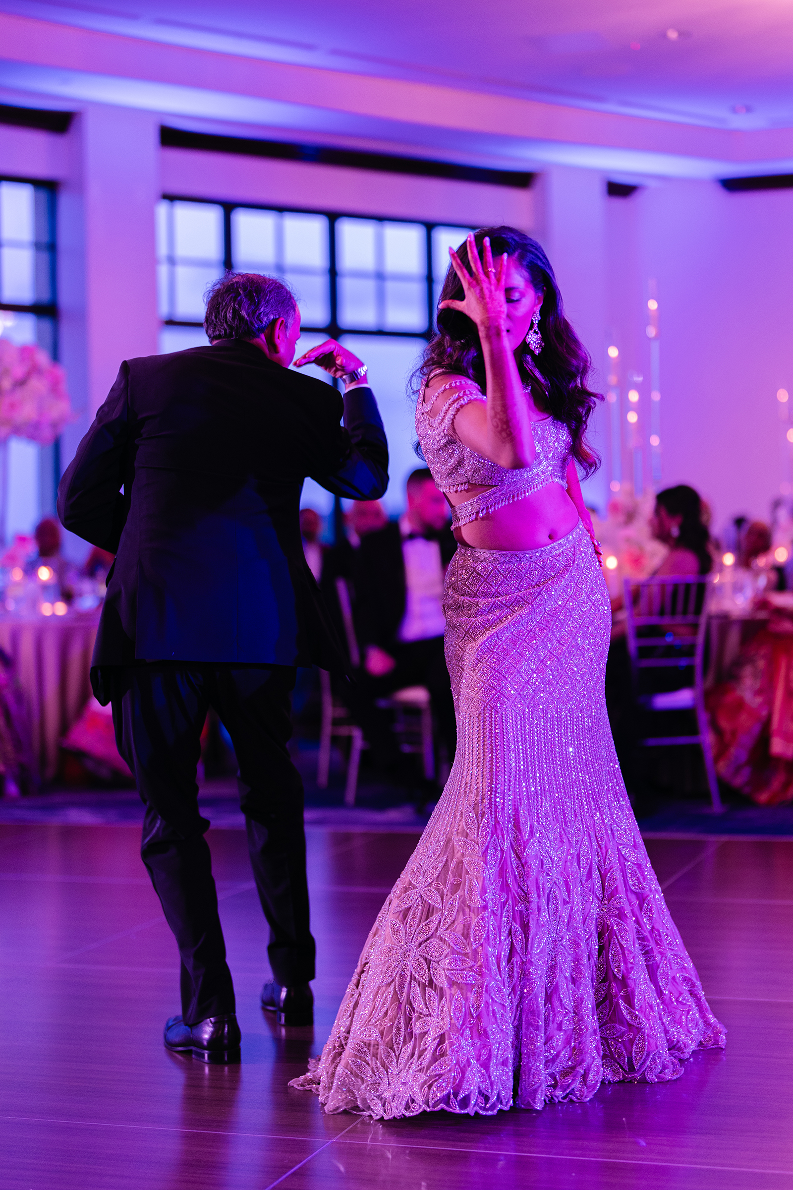 Soft pinks and whites with candlelight lit the Bella Collina Ballroom for their reception. Guests dined on traditional Indian cuisine, thoughtfully curated by the couple with their families.