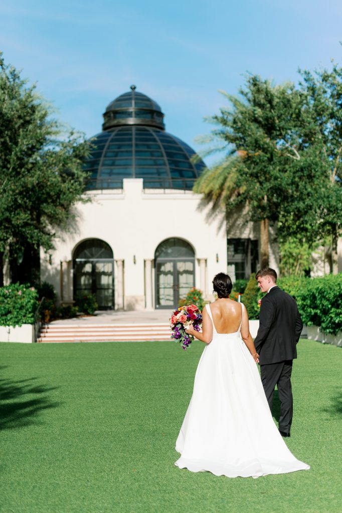 Their wedding was full of pops of color from the yellow and dusty rose bridesmaid dresses, to the flowers. A venue switch also meant a tiny overhaul of their theme – going from peachy corals to jewel tones of marigold, emerald, sapphire and rose! They may not have been able to get married at Disney, but the Alfond Inn’s ballroom was just as magical for their intimate wedding ceremony. The iridescent globes hanging from the ceiling add the perfect touch of magic. And their pianist played beautiful Disney songs during the ceremony (I was especially moved during the ring-warming ceremony when he played the song from Up!) One of my favorite moments of the night had to be the “multimedia” speech from maid of honor (Anna’s sister), Shannon. It was what could only be described as a hysterical tearjerker.