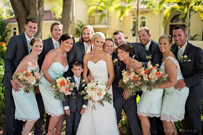 For their big day, Jennifer mixed eucalyptus accents in to a rustic bridal bouquet of coral and gold, and her bridesmaids wore cocktail-length mint-green lace dresses. They were married in her home church, where the sweetest surprise came from Mason, a bit of a “guest of honor” in the form of a guide dog! Jennifer has been raising guide dogs, and Mason was her first. In a way, it was their first “child”, and they were so excited to see him at the ceremony!