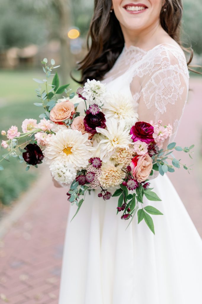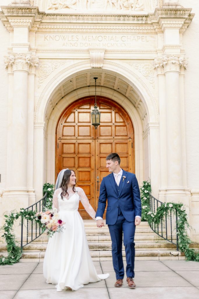 When deciding where to get married, they knew they wanted to choose the place where they spent most of their relationship together – Rollins College! Knowles Chapel is a stunning place and it was so fun doing their photos around campus! At first, we were all a little skeptical of how the weather would hold out. It was raining all morning, but thankfully cleared up in time for their first look! Overcast and chilly, with not a sun in sight, we happily set off from the Alfond Inn to the chapel!