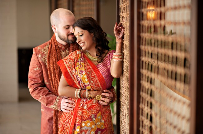 Smruti’s colors were absolutely stunning together! Even though they started with a green scheme to go along with their Bamboo Garden venue, Tim announced he found an orange outfit (his favorite color), and just like that – everything changed to the royal orange and fuschia that really stood out among the gardens.