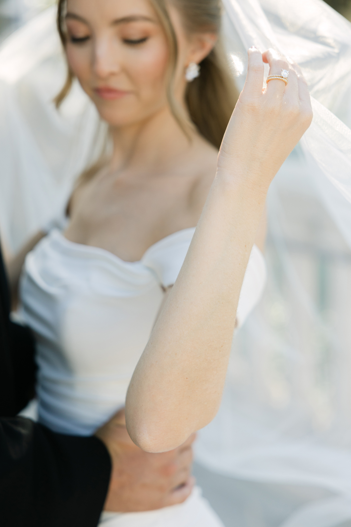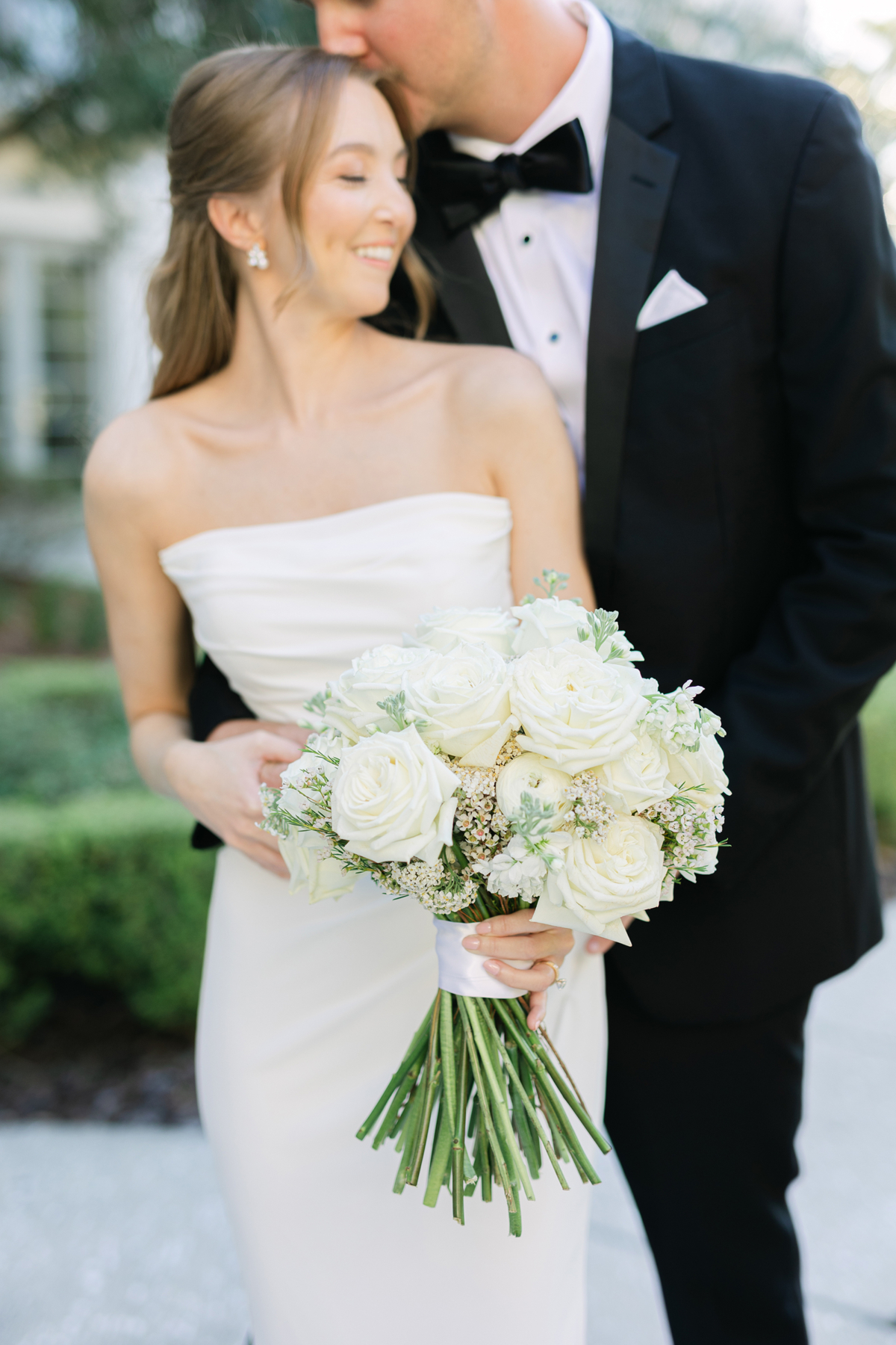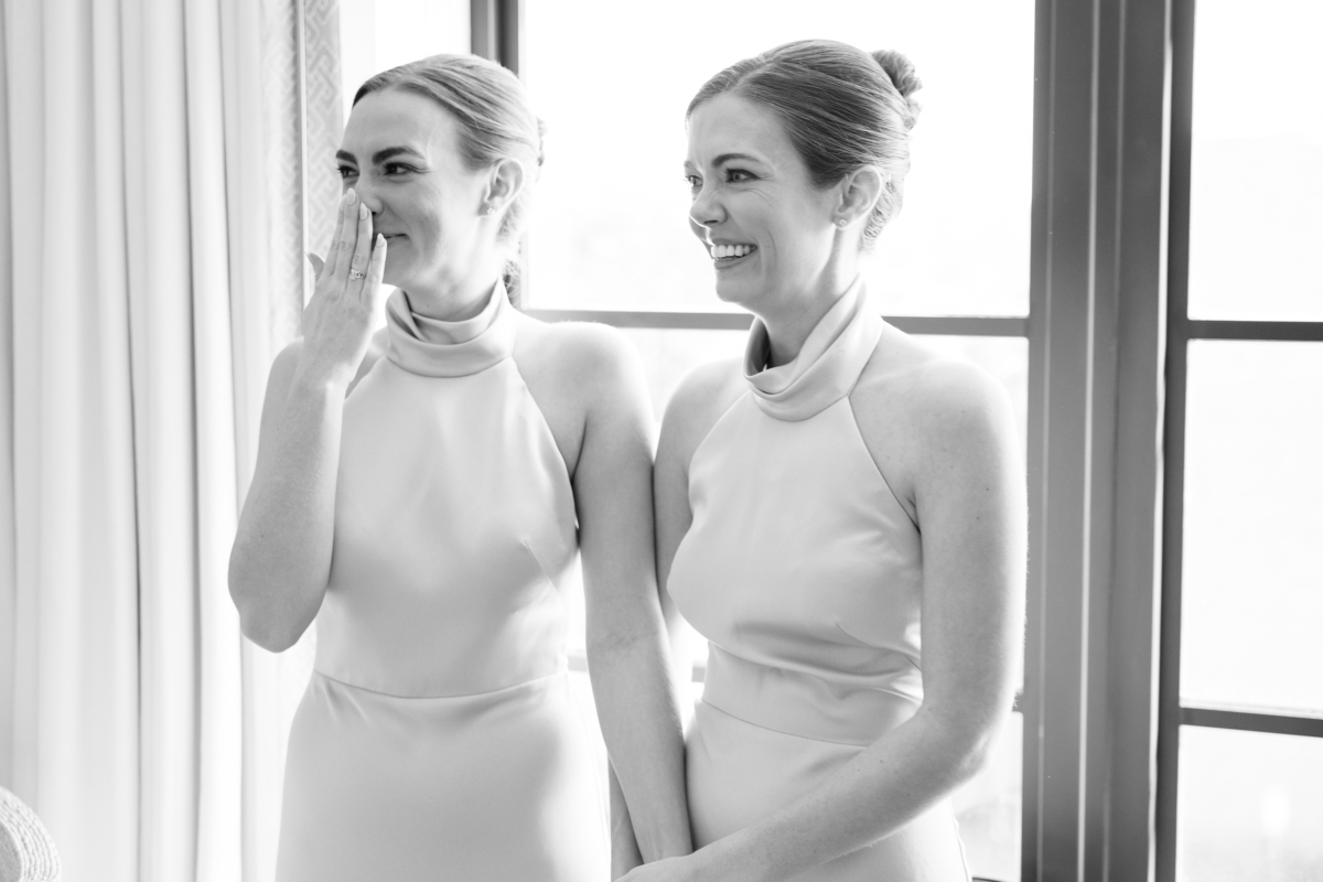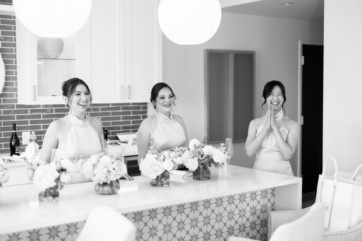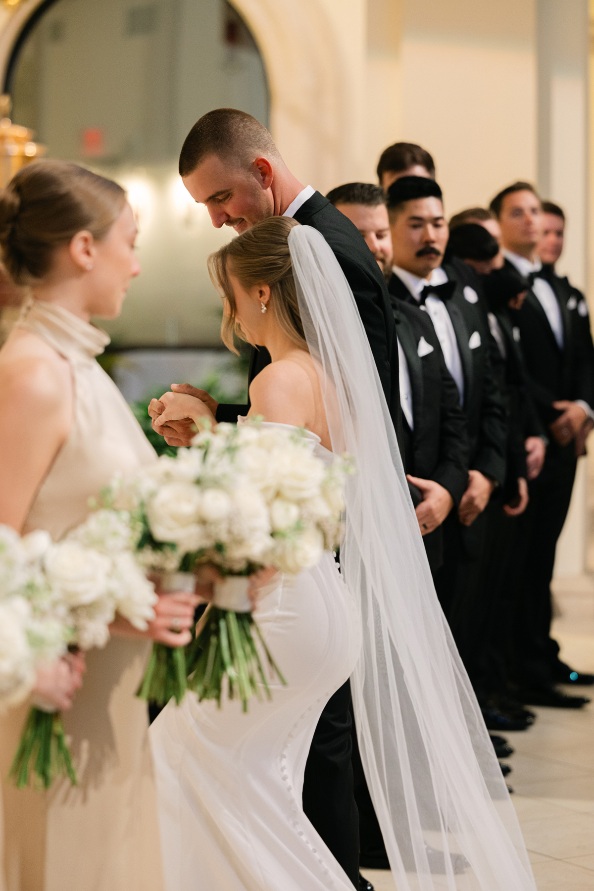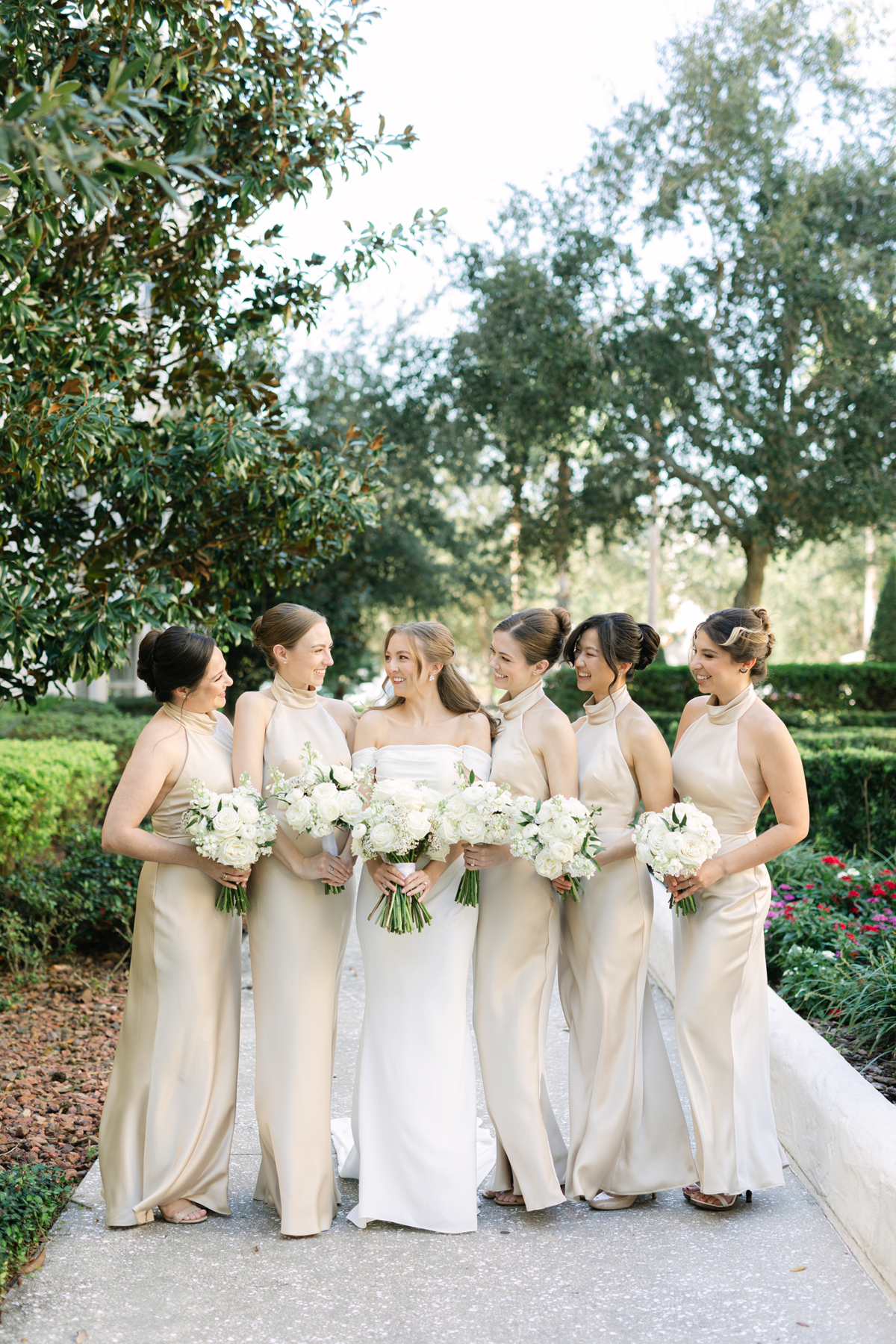 Most people often skip over the preparations leading up to the ceremony, but the intimate moments filled with excited chatter and the supportive gestures from those who have been there for you through it all is what perfectly sets up the celebrations that await. Laura’s bridesmaids surrounded her as she got ready for the big moment that would begin this next chapter of her life. While capturing these sweet, intimate moments, it was clear that the essence of true elegance could be translated through the lens with their matching champagne silk dresses with the feminine touches of a backless moment and high-neck detail. Undeniably, the decision of pairing their outfits with a more simplistic bouquet of white roses and baby breaths delivered an elevated touch that complimented both the bride’s bright personality and her overall sweet appearance.